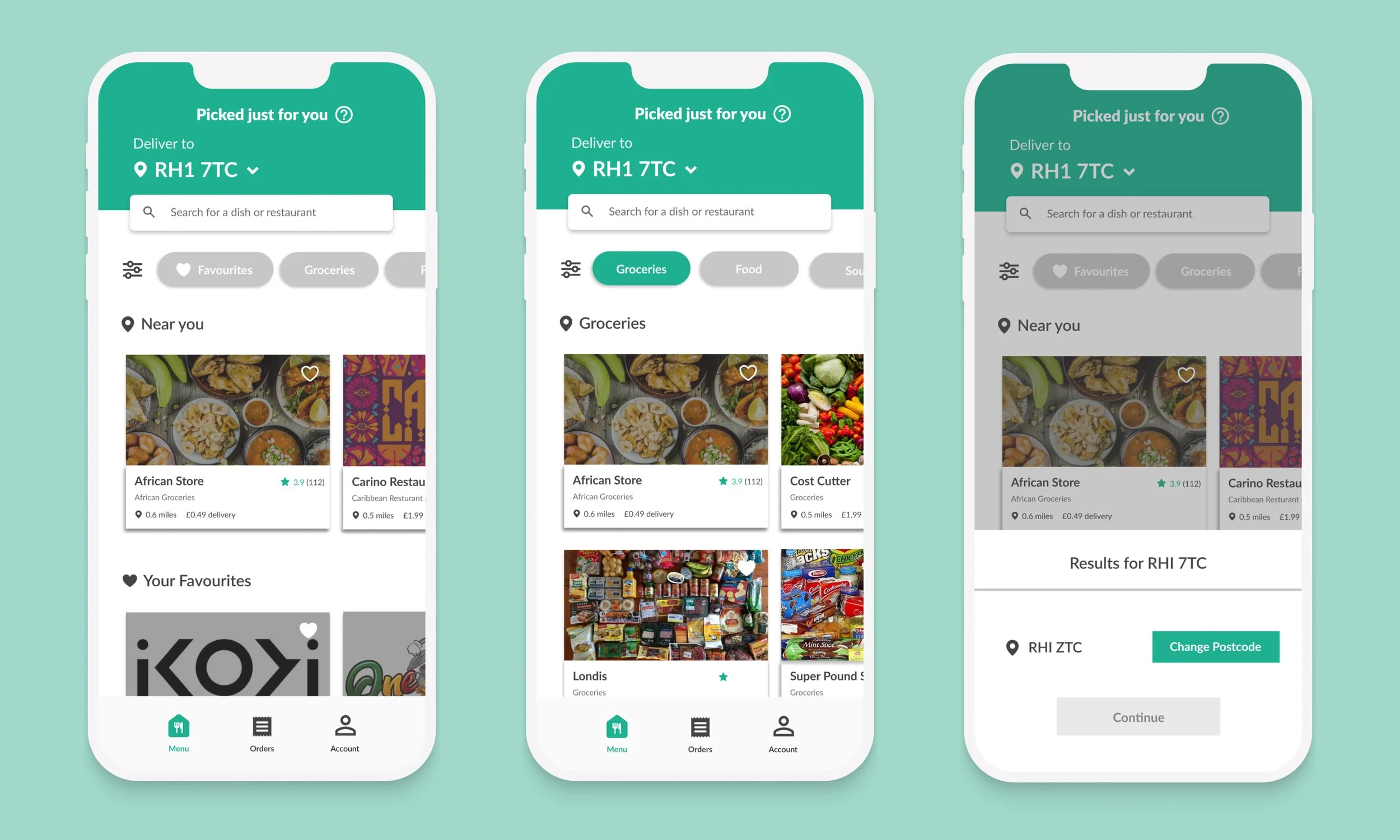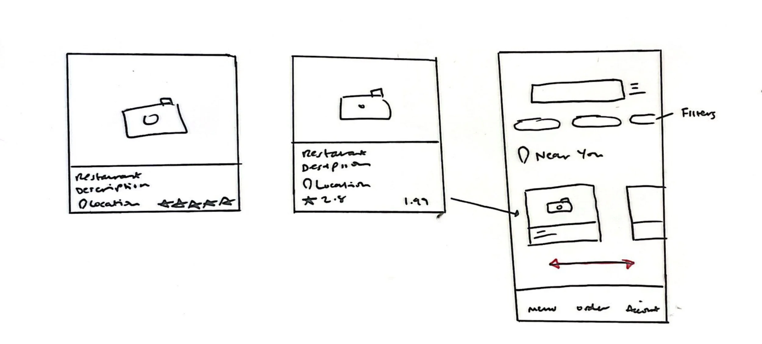 The main menu was designed as a team. I designed the restaurant profiles, I looked for inspiration from other food apps such as JustEats and UberEats to see what are the most important features for users. As a result I gathered that the restaurants name, ratings and distance was important. I created sketches and then we included these profiles on the main Figma prototype.
